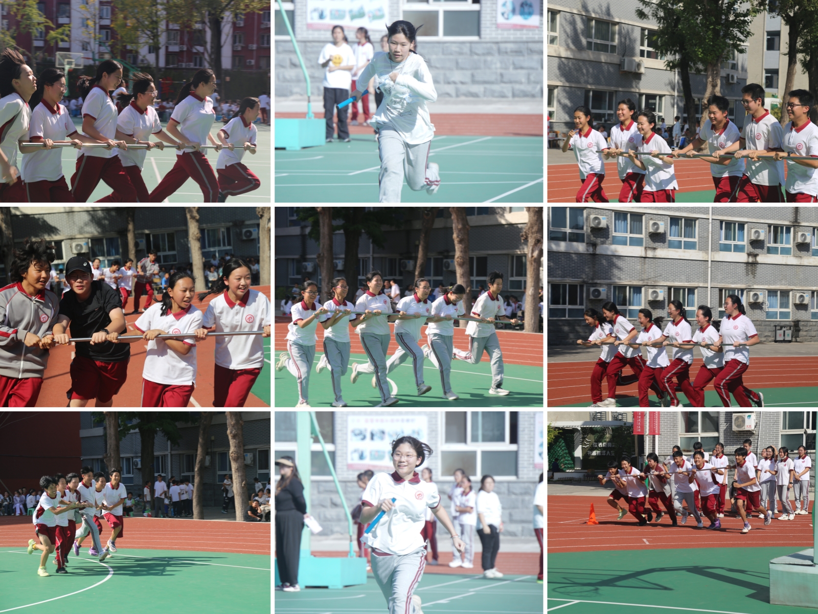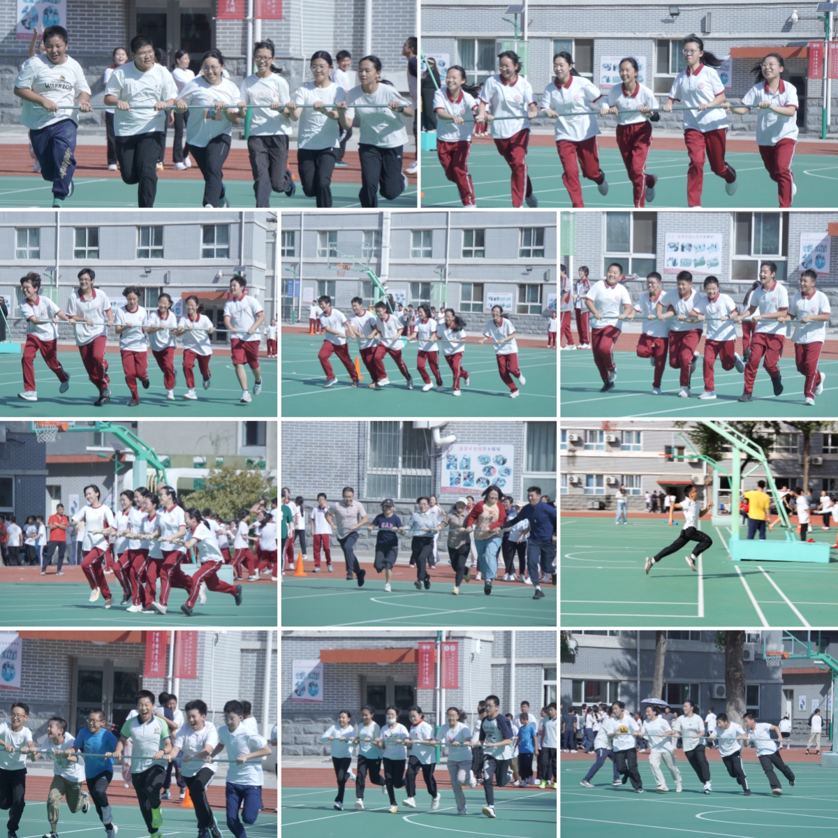 在裁判组老师们的有序组织下,各个年级的旋风跑、迎面接力、拔河三项趣味赛事依次展开。旋风跑项目中,每班18名同学分成3组,手扶长竿绕标志筒完成S形变向接力,展现出极强的团队默契;迎面接力赛里,24名队员在场地两侧接力奔跑,奔跑的身影成为操场上最亮眼的风景。