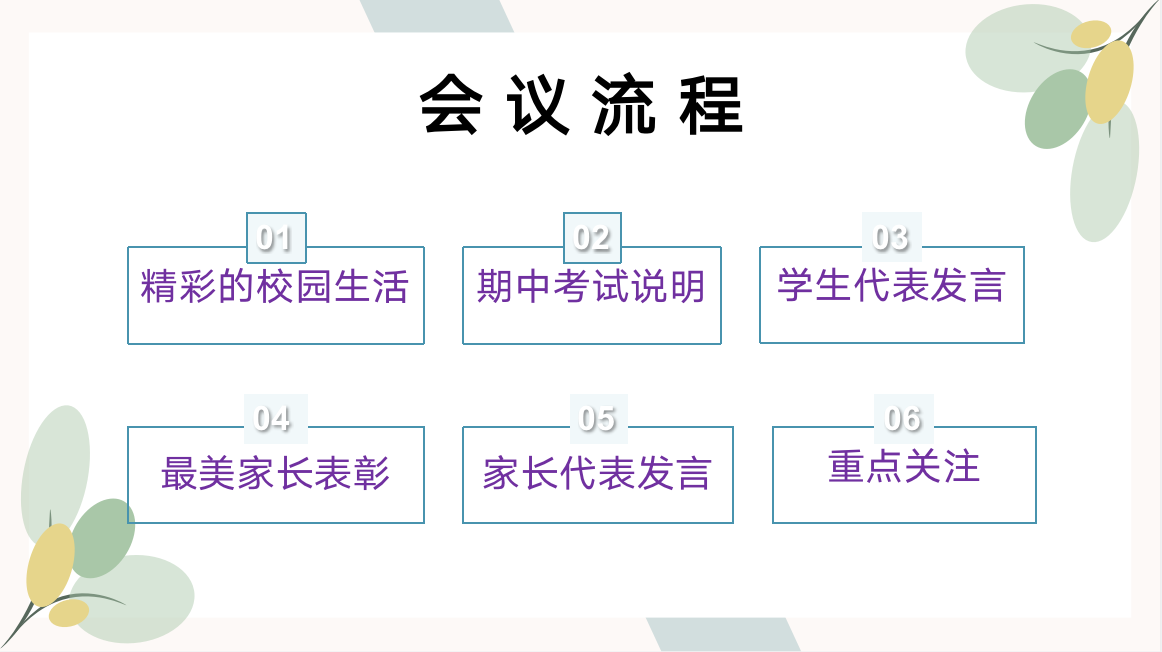 此次家长会以年级为单位召开,主要内容氛围六部分:精彩校园生活、期中考试说明、学生代表发言、最美家长表彰、重点关注