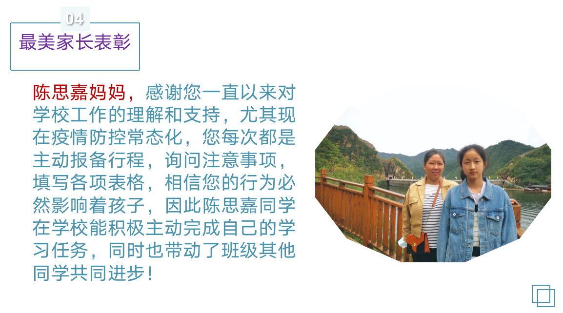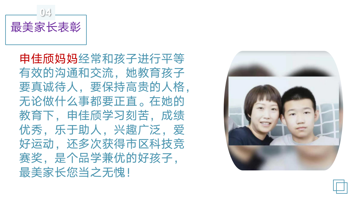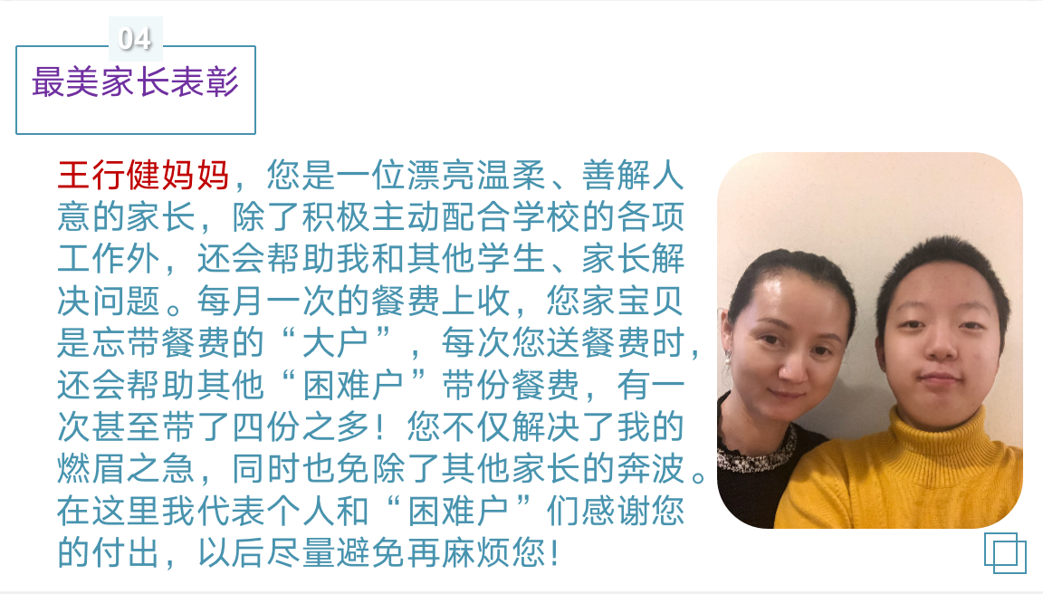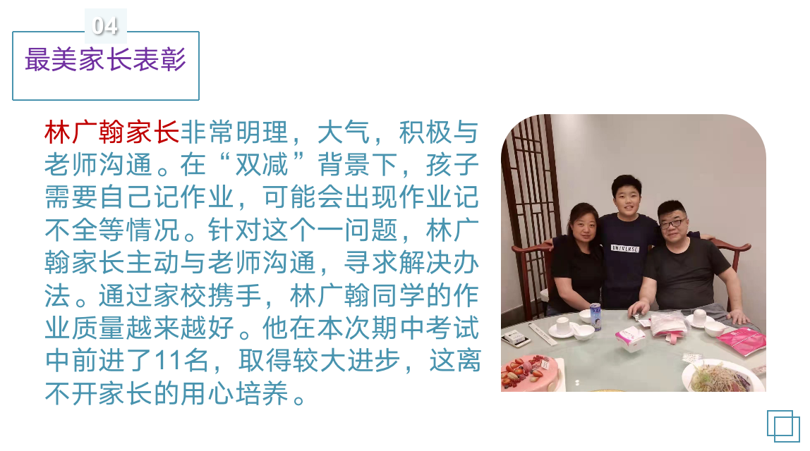 初二年级稳定的发展,离不开家长和年级各位老师的积极配合,故每班推荐一名优秀家长进行表彰