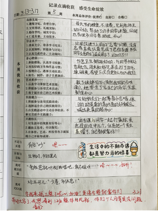 从孟欣的学生成长手册能看出学生写的很认真,老师写的很认真,家长写的很认真。学生把自己的想法都写出来,把跟老师说的话对老师也写出来。老师把对孩子的期望写出来,家长对孩子的期望写出来。这本学生成长手册已经成为能友好沟通家长、学生老师之间的桥梁了,我觉得这正是学生成长手册存在的意义