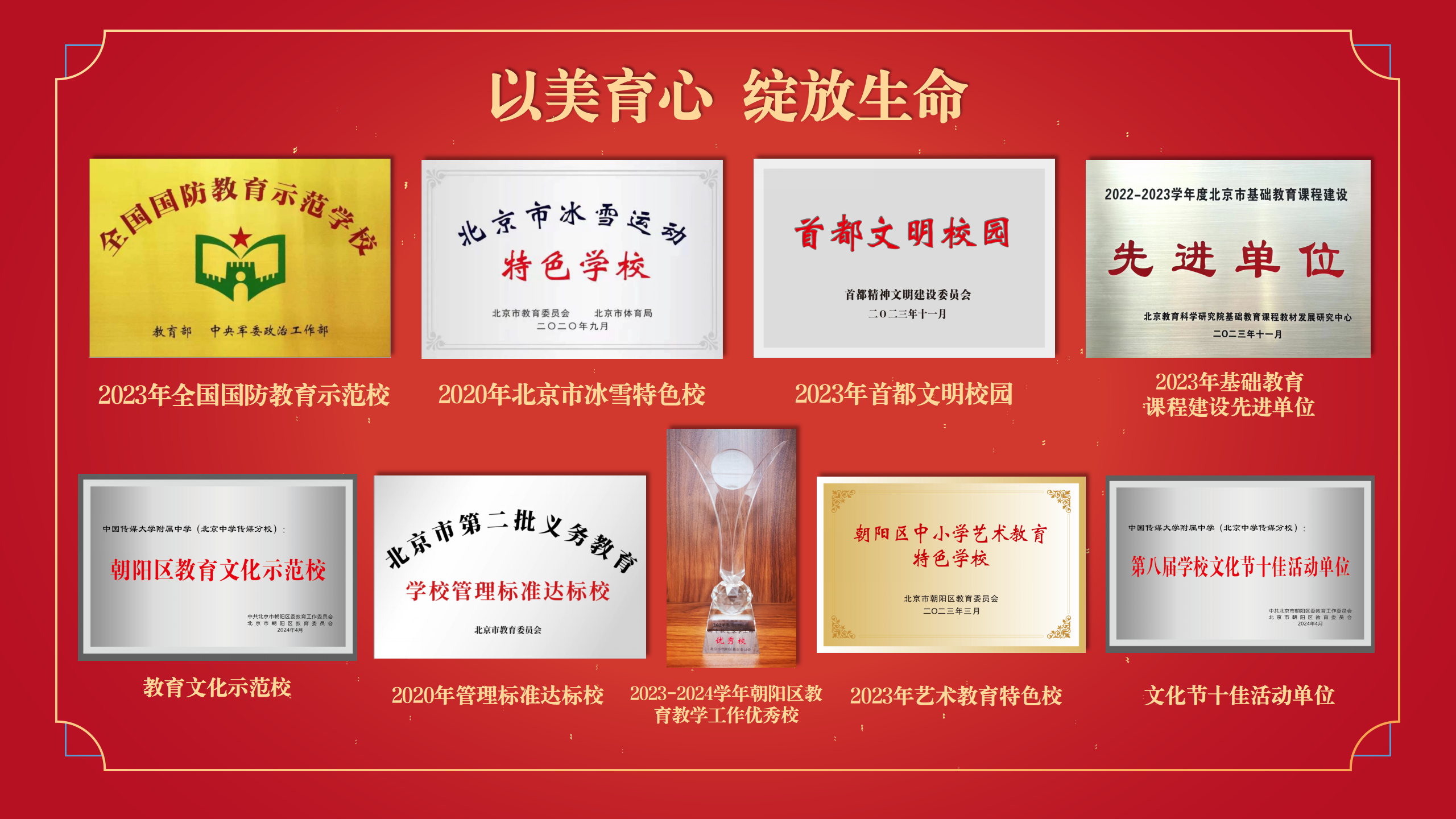 2024年,学校荣获朝阳区教育教学工作优秀校称号,拔尖创新人才培养实现了跨越式发展。学生在体育、艺术、科技领域捷报频传,市区级获奖近百人次。和美课程建设入围市级课程建设优秀成果,并成功举办市级课程研讨现场会。学校荣获北京市课程建设先进单位、首都文明校园、朝阳文化教育示范校等称号,成为北京师范大学循证教育实验校、中国教育科学院AI课堂实验校、中国传媒大学中小学人工智能实践基地。